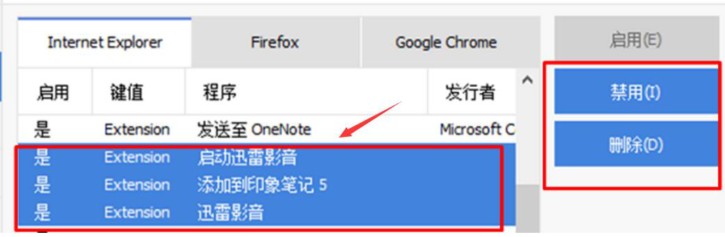5、使用CCleaner将浏览器的各种“隐藏”插件找出来后,觉得一个个处理麻烦,就可以将需要处理的插件都选中,想要保留又不想使用的的,就点击“禁用”按钮,如果想不要了,就点击“删除”按钮。