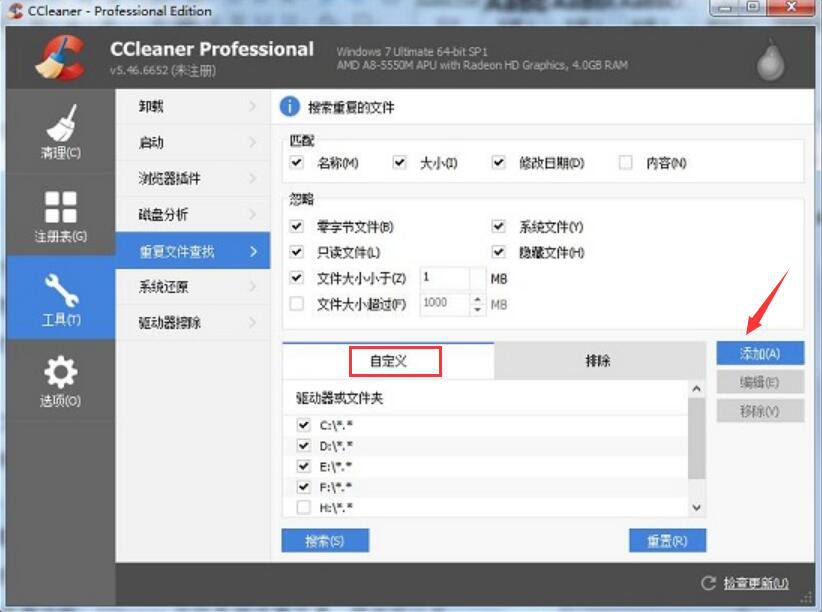 3、CCleaner查找重复文件的时候,用户可以自定义查找哪个磁盘,或者也可以通过点击“添加”按钮来查找其他盘的重复文件。