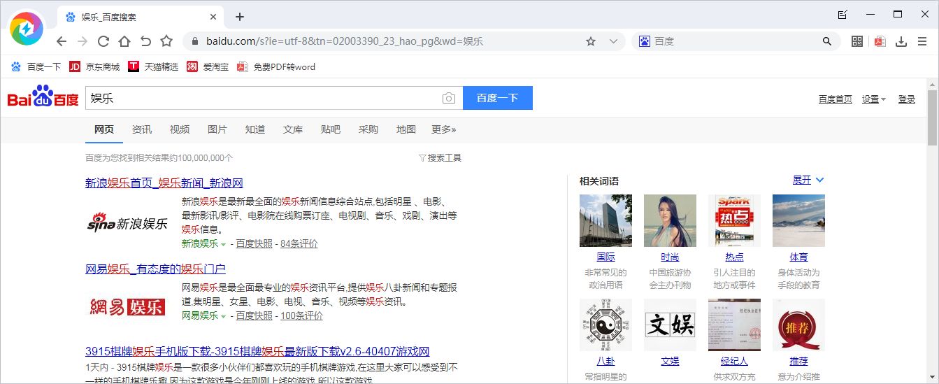 1、打开飞象浏览器,然后搜索任意网页,比如在百度搜索栏中输入“娱乐”。
