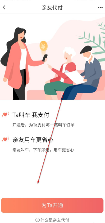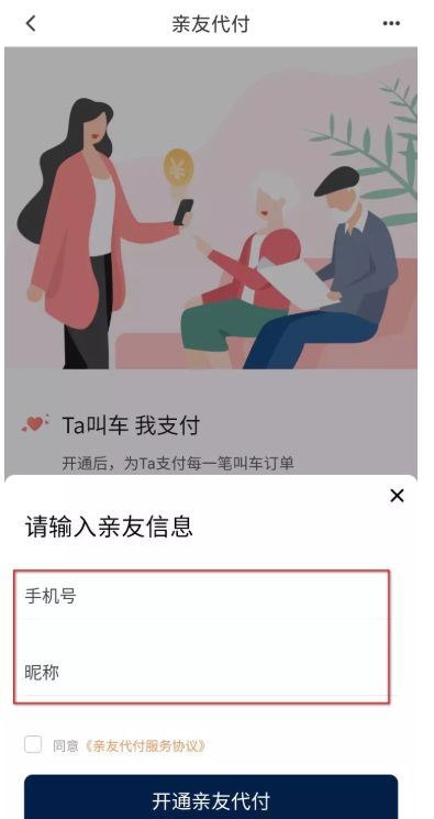 如图,点击【为ta开通】,输入相关信息(亲友手机号、昵称),选择同意协议,点击【开通亲友代付】即可。