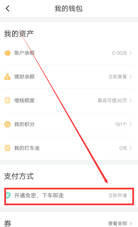 打开我的钱包,如图,点击【支付方式】,选择【开通免密,下车及走】,