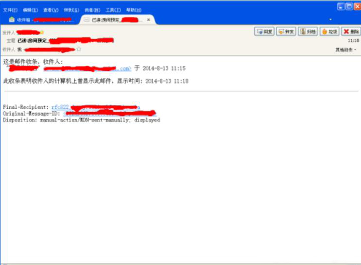 6、完成mozilla thunderbird邮件回执的设置后,比如我们利用mozilla thunderbird发送了一封邮件。如果对方查看邮件了,系统便会弹出如下图的已读提示。