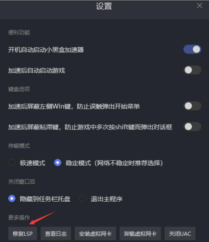 5、当用户重装了小黑盒加速器后,启动游戏还是无带宽的话,那就回到小黑盒加速器的设置界面,点击“修复LSP”按钮,再回到主界面启动加速的功能。如果还是无带宽,就再重启电脑,一般就可以解决小黑盒加速器加速无带宽的问题了。