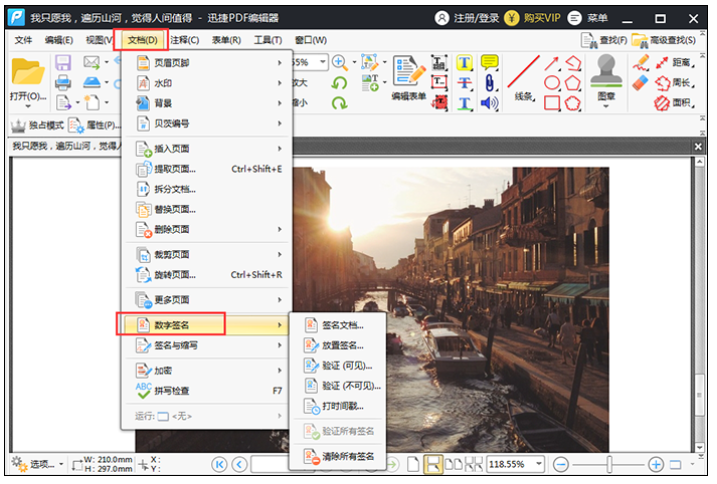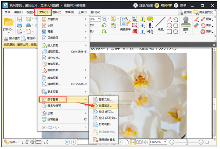 在软件上方菜单栏中点击【文档】——【数字签名】功能,这里有【签名文档】、【放置签名】选项,