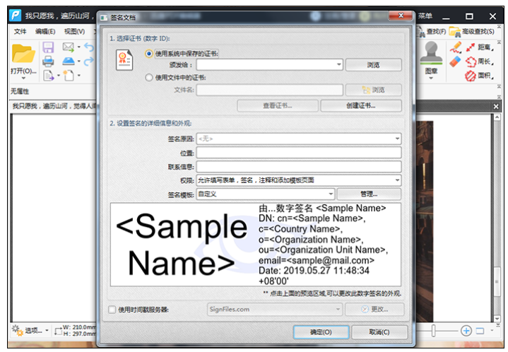 点击【签名文档】,弹出一个面板,如图,设置数字签名,点击确定就行了,