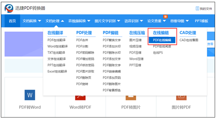 除了使用专业软件,大家还可以通过在线平台给PDF添加数字签名,点击搜索迅捷PDF编辑器,进入官网,在首页中点击【在线编辑】——【PDF在线编辑】,