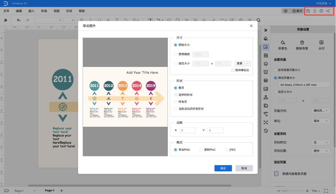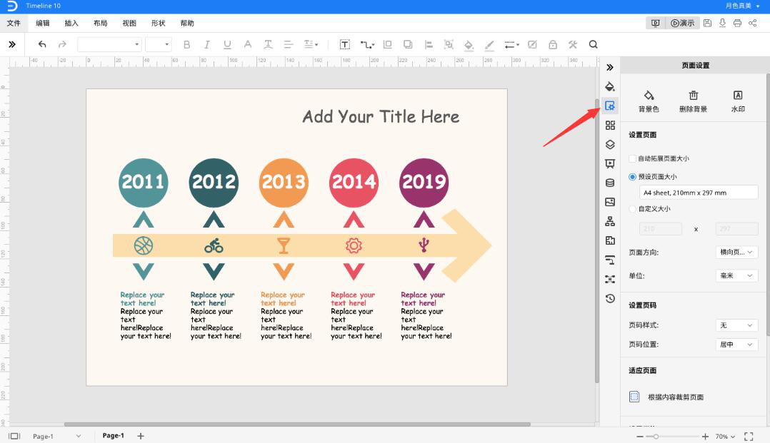 4、如果需要对PPT时间线图的页面进行调整,就点击页面设置工具,调整背景和页面大小。