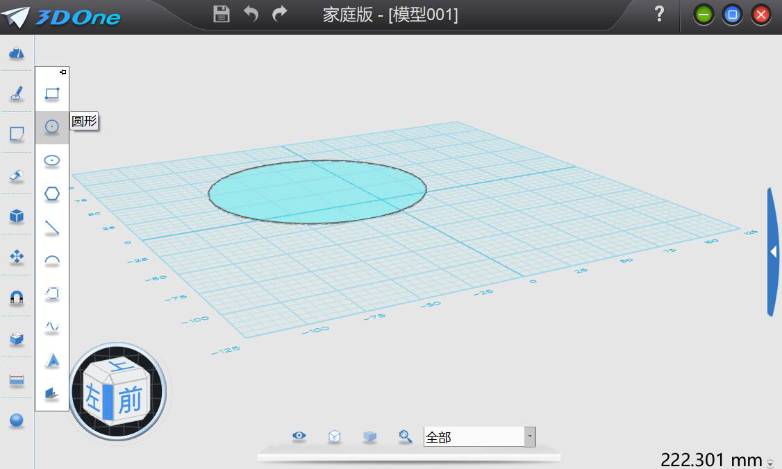 点击“草图绘制”工具中的“圆形”,设置该圆形的坐标和半径数值,即可在3D One画布中通过智能手柄画出圆形草图。