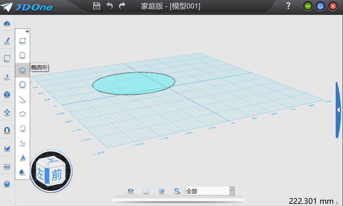 点击“草图绘制”工具中的“椭圆形”,根据自己设置的椭圆形圆心位置和轴长,在3D One画布中即可绘制出如下图的椭圆形草图。