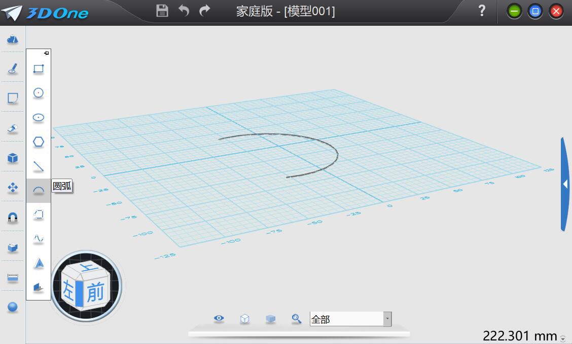 点击“草图绘制”工具中的“圆弧”,在其菜单中设置圆弧的坐标和半径,在3D One画布中直接绘制即可得到草图。