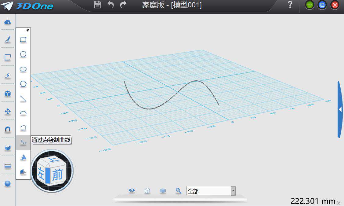 点击“草图绘制”工具中的“通过点绘制曲线”,在其菜单中设定每个曲点的坐标,按住鼠标在3D One画布中按照自己想要的效果直接绘制即可得到草图。