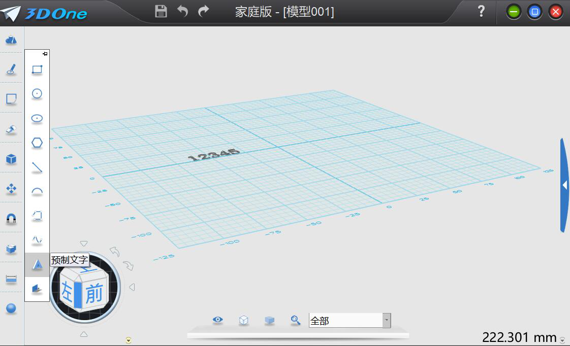 点击“草图绘制”工具中的“预制文字”,设置相关坐标和输入本文内容,在3D One画布中直接绘制,还可以通过智能手柄调整文字的大小和形状。