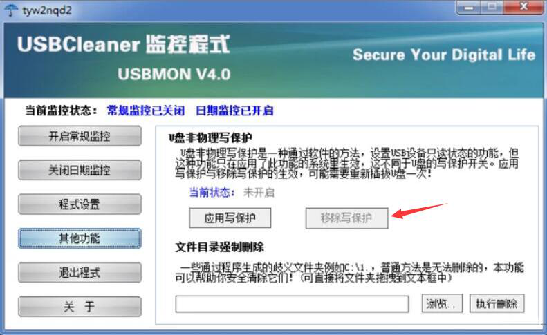 4、最后,在点击USBMON的“其他功能”,在其右侧界面中,点击“移除写保护”的按钮,USBMON解除U盘保护成功。