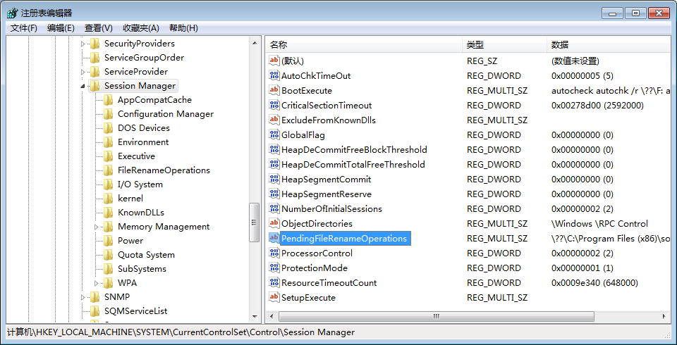 6、在右侧注册表列表中选中【PendingFileRenameOperations】。