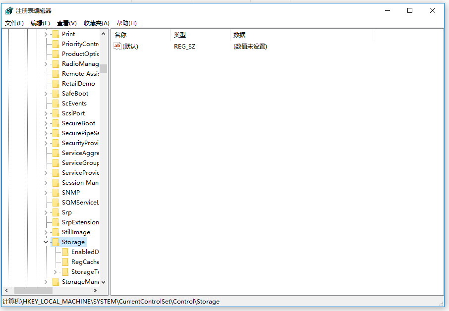2、打开注册表编辑器,依次点击【HKEY_LOCAL_MACHINE\\SYSTEM\\CurrentControlSet\\Control\\Storage】,如图,