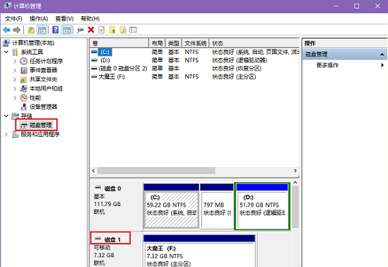 1、将U盘插入电脑,鼠标右击【我的电脑/此电脑】,打开计算机管理服务窗口,点击【磁盘管理】,找到相应U盘的索引名,