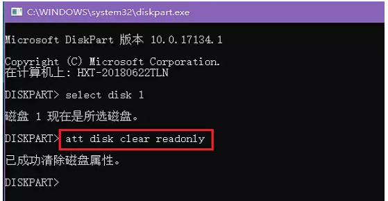 4、如图,输入【att disk clear readonly】命令,即可清除所选择磁盘的属性,U盘写保护状态就被破解了。