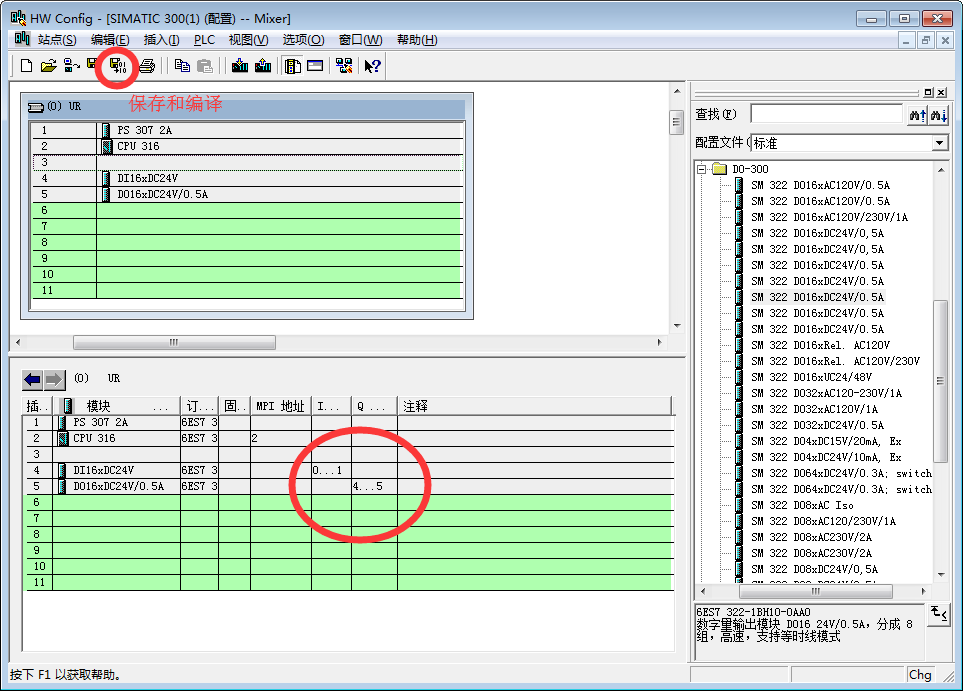 8、选择导轨的第五个slot,然后在右侧配置文件列表中点击【DO-300】双击【SM 322 D016X24V/0.5A】进行安装。