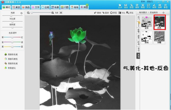 5、点击最上方菜单栏中的【美化】,依次点击【其他】-【反色】,这样图片就会回到正常色调,体现出水墨画风格。
