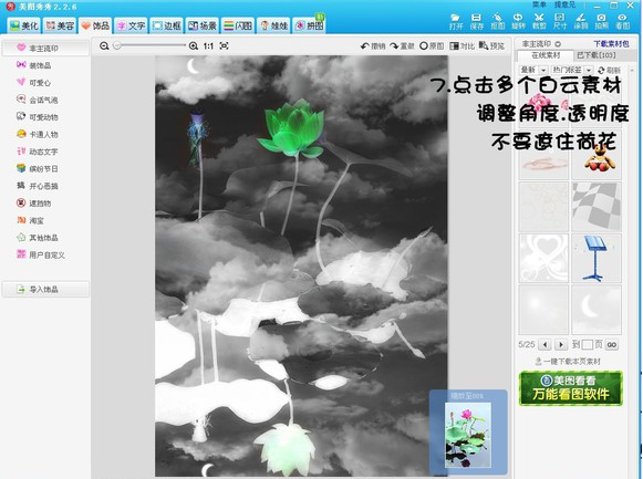 4、点击最上方菜单栏中的【饰品】,然后选择左侧列表中【非主流印】,接着在右侧在线素材中添加多个白云和其他素材,注意调整素材的角度和透明度。