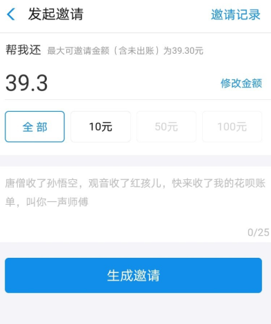 进入【发起邀请】窗口,选择还款全额,你可以选择全部额度,也可以选择部分额度,点击【生成邀请】,