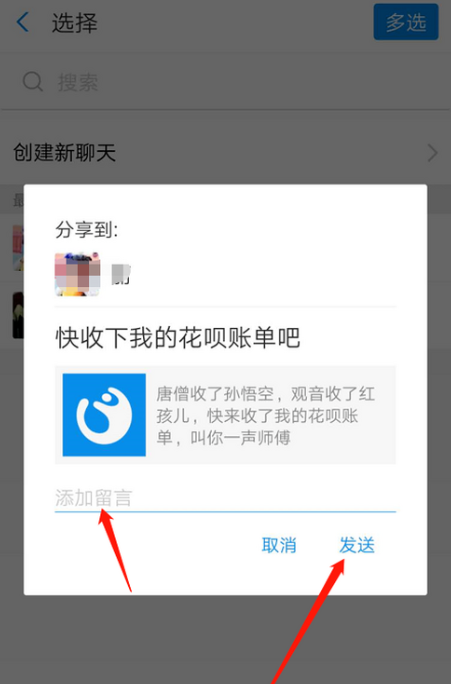 这里选择【朋友】,弹出窗口,勾选指定好友,向朋友发送帮还邀请,对方收到邀请之后帮助还款,你的花呗就还清了。