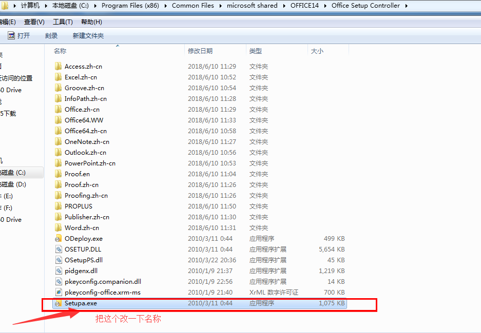 2、依次展开【C:\\Program Files (x86)\\Common Files\\microsoft shared\\OFFICE14\\Office Setup Controller】,找到【Setup.exe】文件,修改名称,如图,我直接加了一个字母a,将其改为【Setupa.exe】,即可解决Office2010配置进度问题!