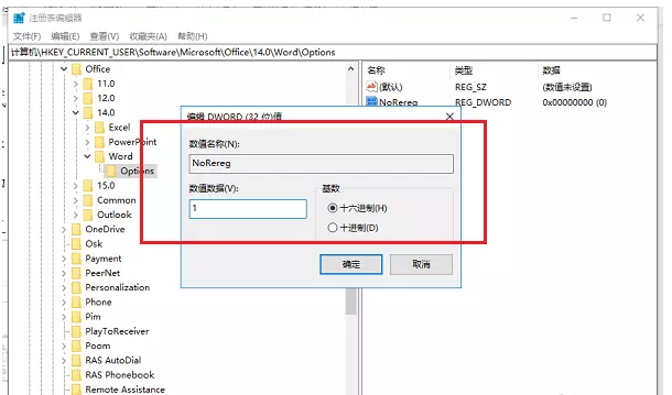 选中新建项,将其命名为NoRereg,双击进行编辑,将【数值数据】修改为1,点击确定,关闭窗口,重启电脑,即可解决Office2010配置进度问题。