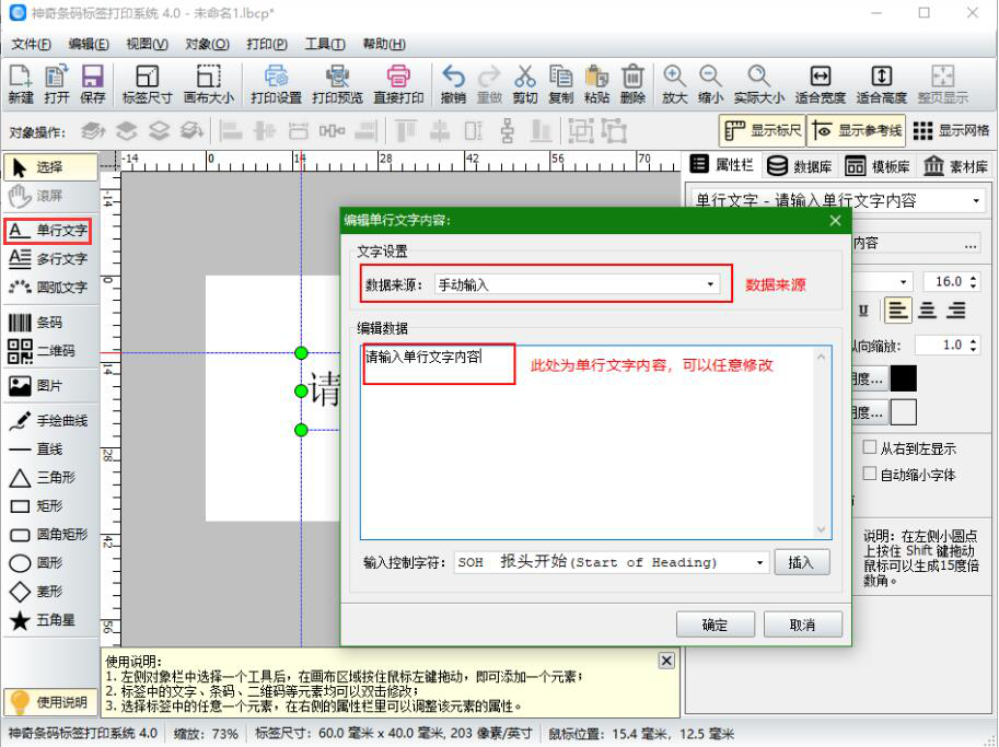 5、接着创建内容不同的条形码标签,点击界面左侧的“单行文字”,并在其弹出的窗口中输入相关内容。