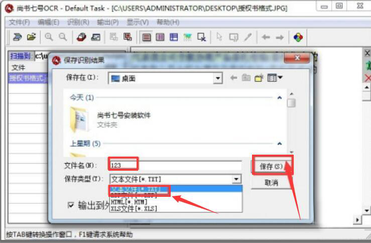 7、此时,尚书七号OCR会弹出如下图的窗口。用户输入文件名,选择“*.TXT”的格式,点击“保存”按钮。