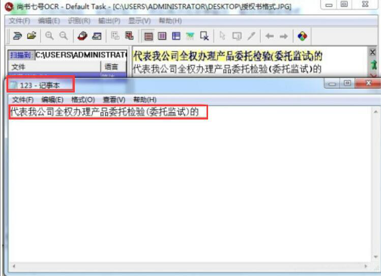 4、选好文字内容,点击“识别”菜单中的“开始识别”,尚书七号OCR便开始执行识别文字的指令。