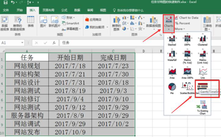 1、首先,用户打开用来制作甘特图的源Excel表格。点击Excel“插入”菜单栏中的“Charts”,并从中点击“Thinkcell”。