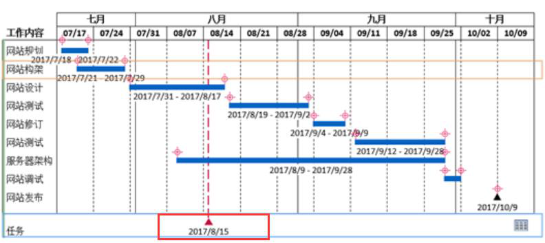 7、点击Thinkcell甘特图的进度条时,会出现一个红色锚点,我们可以直接拖动它来更改项目工作内容的进度。
