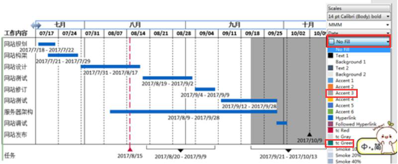 11、Thinkcell制作甘特图时,除了可以添加跟踪线,还可以替换它的背景颜色,让整个甘特图看起来更美观。