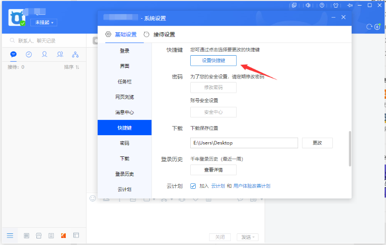 打开系统设置面板,点击【基础设置】——【快捷键】,选择【设置快捷键】,