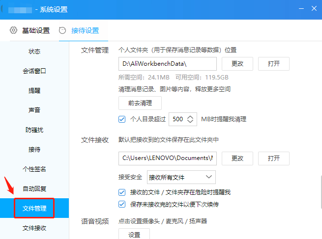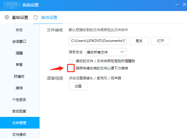 打开系统设置面板,点击【接待设置】——【文件管理】,查看文件接收选项,如图,勾选【接收的文件/文件夹存在危险时提醒我】和【保存未接收完的文件以便下次续传】,即可设置成功。