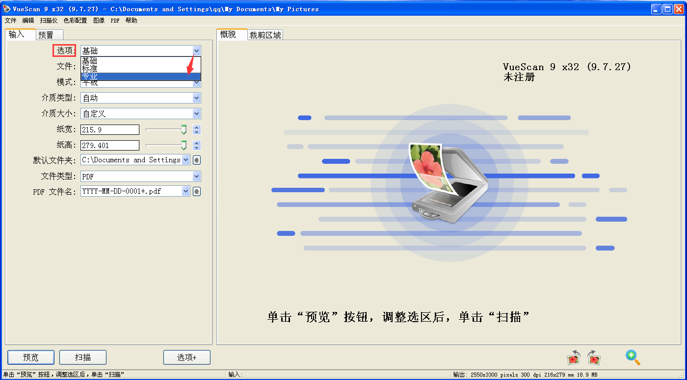 1、打开VueScan软件,将输入下选项中基础改为专业。