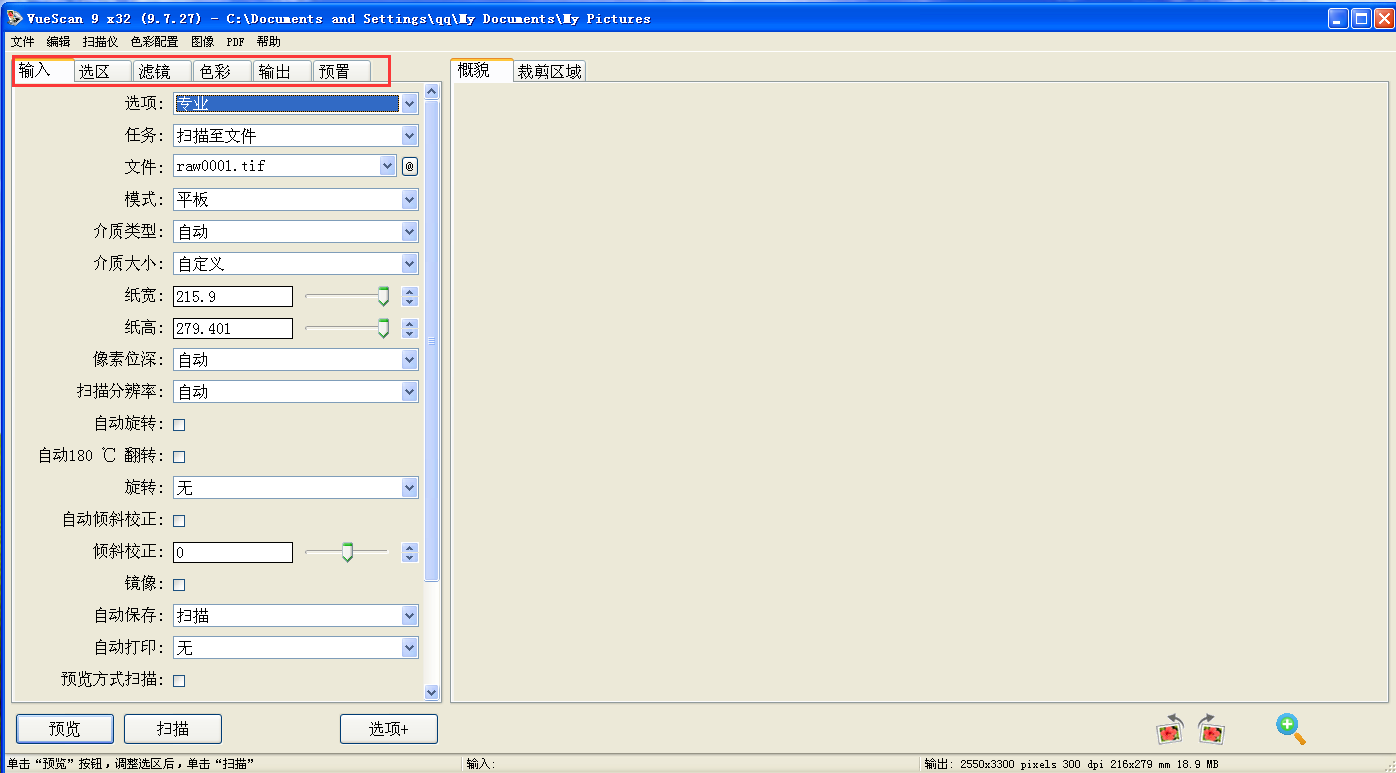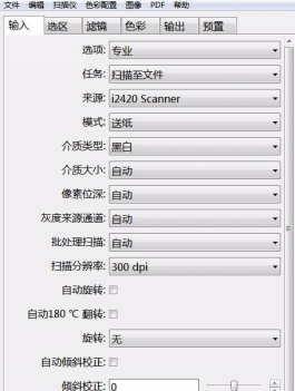 2、这时会进入专业模式,上方标签栏也由2个变为6个即输入、选区、滤镜、色彩、输出、预置,我们这里主要设置输入和输出这两个标签页面。