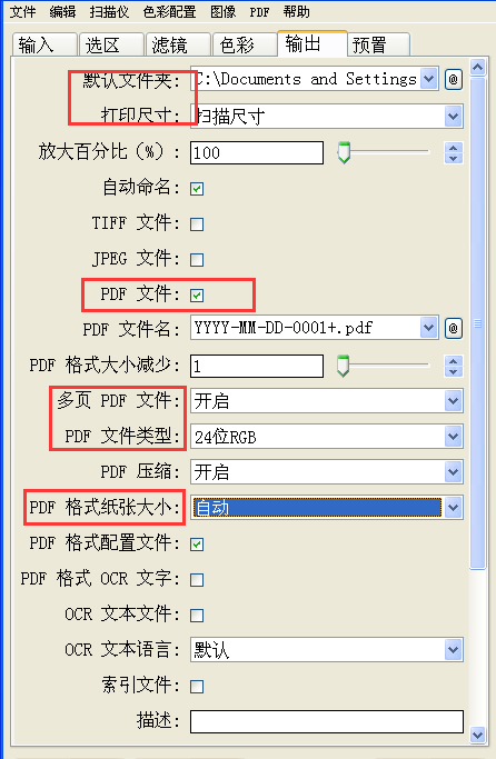 4、关于输出界面的配置。选择【输出】页面,在此界面我们可以对输出文件路径、导出格式(图片或PDF),开启多页PDF文件,PDF文件类型24位RGB,压缩最好打开,然后就可以直接扫描出PDF文件了!