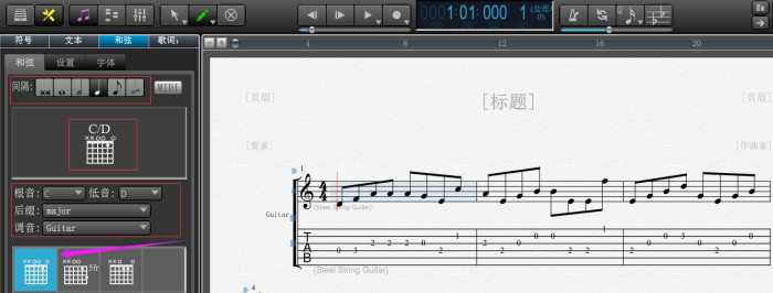 1)设置和弦间隔音,比如将四分音符作为间隔音(如图)选择为乐谱添加和弦。