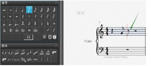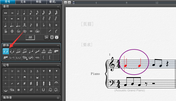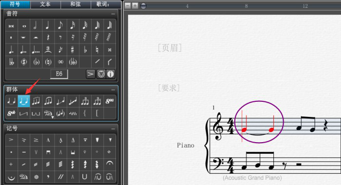 选择【符号】选项,在【群体】列表中图中箭头所示(左起第二个图标)即为连音线图标。点击该图标,然后选择要添加连音线的音符,添加完成后各音符之间会以弧形实线相连。音符之间的弧形实线就是连音线,它的作用是要求演奏这些音符时要圆滑和连贯。