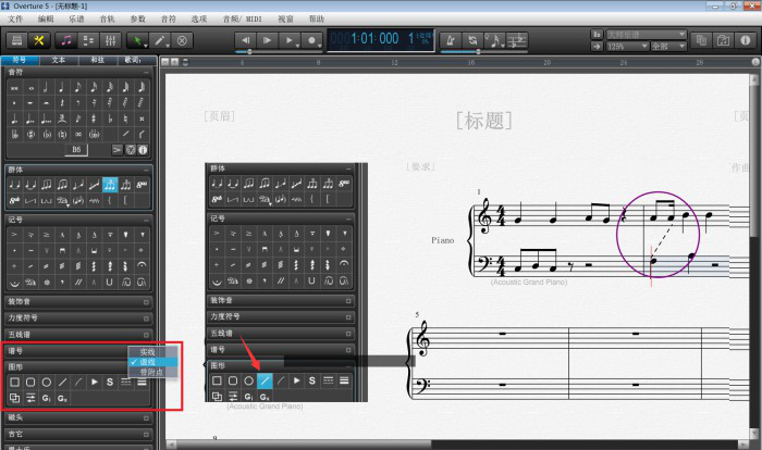 然后打开【图形】列表使用【直线工具】,在乐谱上直接绘制即可。旋律线的主要用来表示乐谱主旋律的走向。