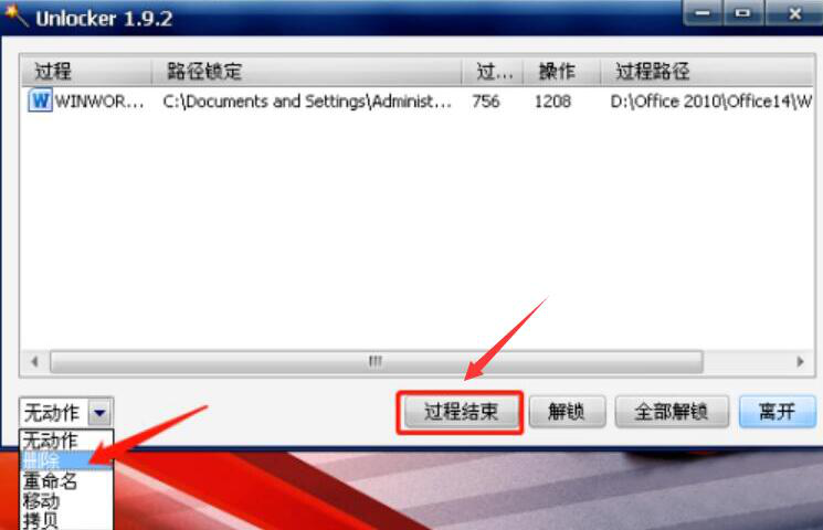 5、此时,强力删除软件Unlocker便会弹出如下图的操作界面。在界面的下拉框中点击“删除”,再点击界面下方中部的“过程结束”按钮。