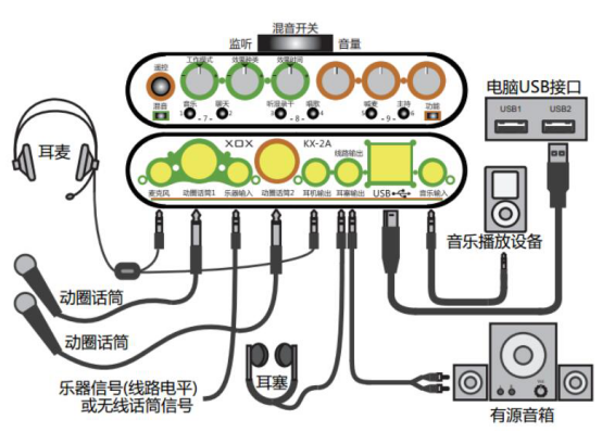 1.在讲述客所思kx2连接电脑之前,先通过下图来熟悉下它的每个按键和插孔对应的功能。