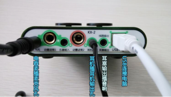 2.根据自己的需要,连接麦克风插孔、耳机输出插孔、耳塞输出插孔。在客所思kx2的右侧,有个USB的插口,它就是用来连接电脑的。我们将连接线一头插到客所思kx2的USB插口,一头插到电脑的USB插口,即可实现客所思kx2与电脑的连接。