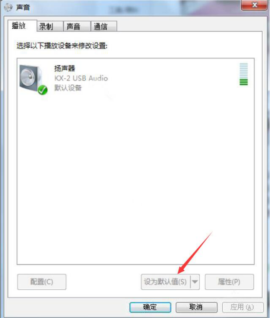 4.接下来,右键单击电脑任务栏右端的声音图标,选择“声音”。在声音卡中,先点击“播放”中的扬声器,再点击“设为默认值”的按钮。