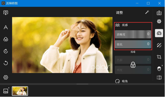 其实,用泼辣修图来提升人物面部质感的时候,我们一般都是通过“调整”菜单中的“质感”功能,调整它的清晰度和锐化度就可以得到自己想要的效果了。