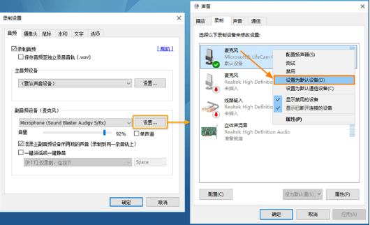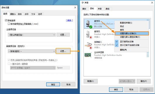 2、点击在副音频设备一栏右侧的【设置】,弹出Windows声音窗口,在录制标签下右击【麦克风】,在其下拉菜单中选中【设置为默认设备】,然后点击【属性】。