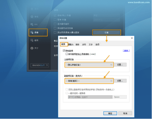 1、打开Bandicam 软件,选择左侧【录像】,点击右侧【设置】,在弹出的新窗口中选择【音频】,副音频设备一栏选择麦克风设备,然后勾选“混录主副音频设备所再现的声音”。