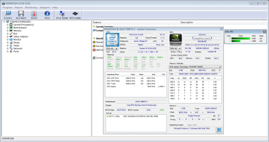 3、左侧是CPU的相关信息包括名称、频率、各个实际核心的频率、硬盘和光驱的参数等;右侧主要显示芯片、主板和芯片组的相关信息。